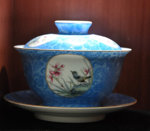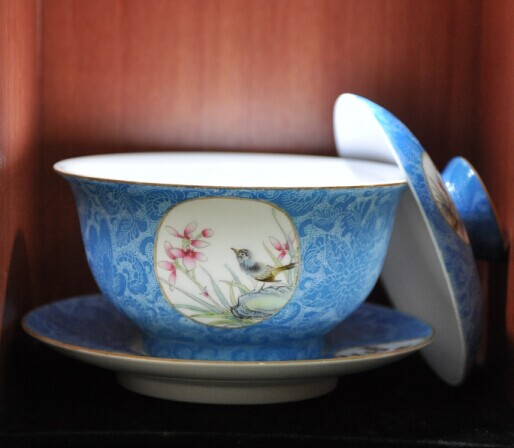 藍(lán)地粉彩扒花蓋碗