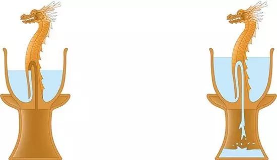 在外人看來,戒盈杯內(nèi)部立著的是一個龍形或是老人,其實,在裝飾物里面,藏著一根中空倒U形虹吸管,虹吸管右端比左端稍高,與杯中酒連通,左端穿過杯底與杯外大氣連通,當(dāng)杯中酒低于虹吸管頂部時,因酒未充滿虹吸管,管內(nèi)的酒只能停留在倒U形的右端,不會從杯底排出;